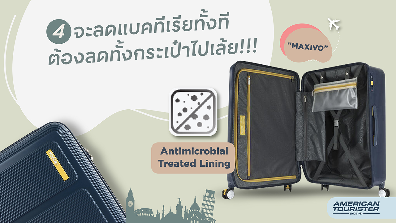 ใช่ว่าเนื้อผ้าแบบพิเศษ Antimicrobial จะมีแค่ที่กระเป๋ารอง ตัวกระเป๋าหลักก็บุด้วยเนื้อผ้า Antimicrobial Treated Lining ชนิดนี้เช่นเดียวกัน ถึงแม้จะเกิดความเปียกชื้นใดๆ ขึ้นภายในตัวกระเป๋า ด้วยคุณสมบัติเด่นของเทคโนโลยีนี้ เชื้อโรคจึงไม่สามารถเติบโตและไม่อาจเกิดกลิ่นไม่พึงประสงค์ต่อตัวกระเป๋าและข้าวของของเราได้ แต่เพื่อเป็นการป้องกันไว้ก่อน ของเหลวใดๆ ที่พกข้ามน้ำข้ามทะเลไปด้วย อาจจะเป็นสกินแคร์ชิ้นโปรด ควรเก็บไว้ในกระเป๋าแยกต่างหาก เช่น กระเป๋าอเนกประสงค์ที่มาพร้อมกับ Maxivo จะดีที่สุด และที่เริ่ดไปกว่านั้น มือจับด้านบนกระเป๋าและมือจับคันชักยังทำจากวัสดุพิเศษที่มีเทคโนโลยี Antimicrobial อีกด้วย ซึ่งสองจุดนี้เป็นจุดที่เชื้อโรคมักอาศัยอยู่มากที่สุดจุดหนึ่งผ่านทางการจับ เรียกว่าใส่ใจความสะอาดกันแบบเป๊ะเวอร์